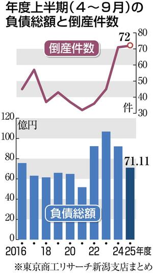 東京商工リサーチ新潟支店がまとめた2025年度上半期(4〜9月)の県内企業倒産状況(負債額1千万円以上、任意整理含む)は、倒産件数が前年同期比1件増の72件、負債総額は22・8%減の71億1100万円だった。上半期で見ると件数は4年連続の増加で、72件は11年度の82件に次ぐ水準となった。負債額1億円未満の倒産が73・6%を占め、負債総額を押し下げた。