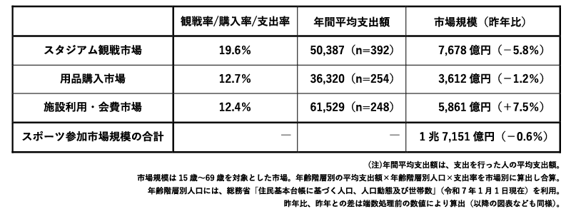 スタジアム観戦、用品の購入、施設利用・会費・スクール料など、過去1年間のスポーツ活動への参加にかかる支出を対象としたスポーツ参加市場規模は1兆7,151億円となった。【図表2参照】