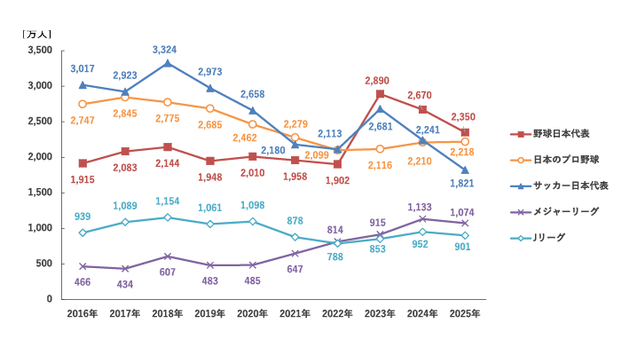 Jリーグのファン人口を推計すると901万人(昨年比5.4%減)となった。