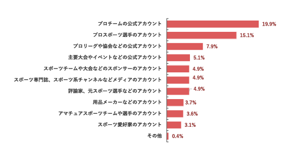SNSでスポーツ関連の情報を閲覧している割合は57.3%。閲覧に利用しているSNSはYouTubeが多い。一方で投稿している割合は17.6%。投稿しているSNSはX(旧Twitter)、Instagramが多い。【図表12参照】SNS閲覧者がフォローしているアカウント先は、プロチームの公式アカウント、プロスポーツ選手のアカウントが多くなっていた。【図表13参照】
