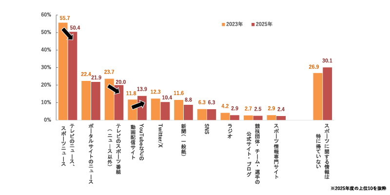 スポーツ情報の入手先は「テレビのニュース」が過半数で最多だが2年前より5.3ポイント減少、