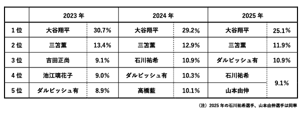 好きなスポーツ選手ランキングでは海外活躍選手が上位を占め、大谷翔平選手が8年連続で1位に。