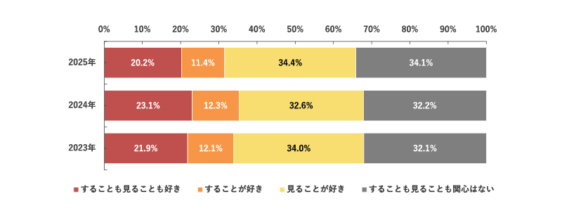 スポーツ関心層(「することも見ることも好き」「することが好き」「見ることが好き」)は7割弱(65.9%)であり、昨年から2ポイントほど減少した。スポーツを「することが好き」な人は3割強(31.6%)、「見ることが好き」な人は5割強(54.6%)であり、全体としては「すること」よりも「見ること」が好きな人の方が多い。【図表1参照】