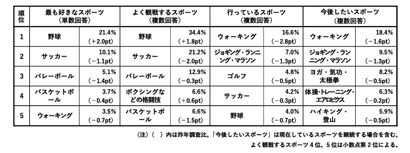 「最も好きなスポーツ」は野球が22年連続第1位であり、上位のスポーツの中で唯一人気が上昇した。「よく観戦するスポーツ」でも野球は昨年より上昇し、ボクシングなどの格闘技も上位に入った。「行っているスポーツ」の上位は軒並み実施率が減少、中でもウォーキング、ジョギング・ランニング・マラソンの下落幅が大きい。「今後したいスポーツ」でも同じ傾向が見られた。【図表4参照】