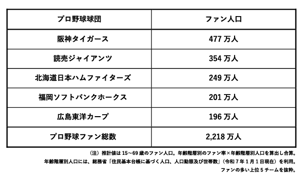 球団別では阪神タイガースのファン人口が最多で477万人、前年比14.9%の大幅増。