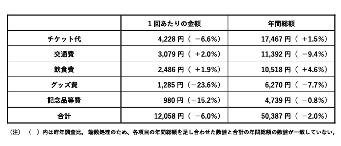 過去1年間にスタジアム・競技場でスポーツ観戦をしたと回答した人の割合は昨年から0.7ポイント低下し19.6%となった。観戦者1人あたりの平均観戦回数は昨年の4.0回から4.2回に増加した。観戦1回あたりの支出額は12,058円(昨年比6.0%減)、年間総額は50,387円(同2.0%減)であった。【図表3参照】