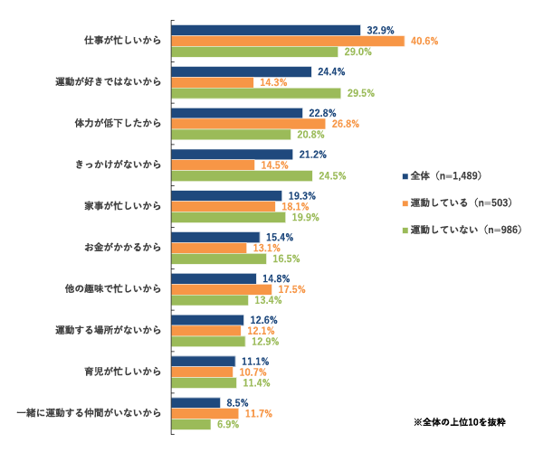 運動不足を感じている人は74.5%にのぼる。運動をしている人としていない人で比較すると、運動をしていない人では8割(80.4%)が運動不足を感じている一方、何らかの運動をしている人でも65.0%が運動不足を感じている。【図表14参照】運動不足の理由としては「仕事が忙しいから」が最多の32.9%、次いで「運動が好きではないから」が24.4%である。運動をしていない人の理由の最多が「運動が好きではないから」であり、「きっかけがないから」という回答も多かった。【図表15参照】