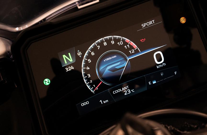 5インチのフルカラーTFTディスプレイを採用。速度やデジタルバーによるタコメーターの他、燃料計、平均燃費、水温計、気温計、シフトインジケーターなどの表示機能を搭載。各機能の情報操作、セレクトは、コンパクト化に貢献するFPC(Flexible Printed Circuits)を組み込んだ直感的操作が可能なハンドルスイッチで行います。表示パターンは、4種のテーマとラップタイムをメインにしたTrackモードがあり、好みや走行シチュエーションに応じて選択可能。