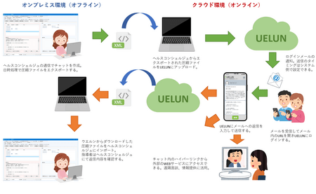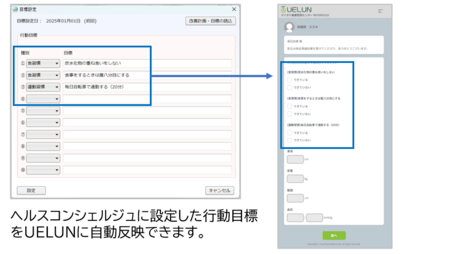 また、近年のオンライン支援の拡大や、チャットツールを活用した行動変容支援のニーズにも応えるため、チャットツール「UELUN」や保健指導支援ツール「ヘルスジャッジ3」との連携を実現。