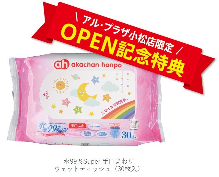 オープン記念特典として、セール期間中お買上げいただいた方に「水99%Super 手口まわりウェットティッシュ(30枚入)」をプレゼントいたします。(各日先着200名様限定 ※1家族様1点限り)