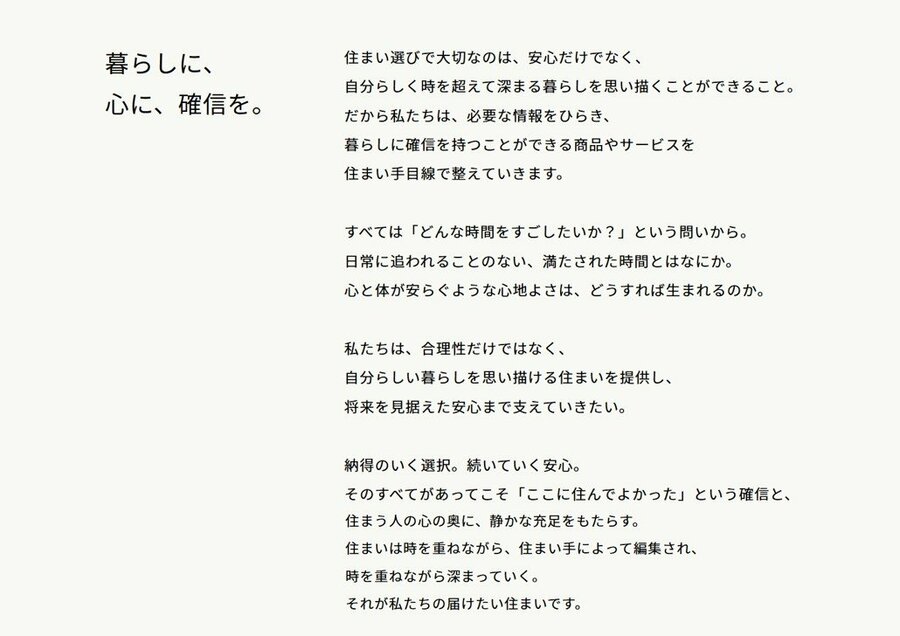 コンセプトは「暮らしに、心に、確信を。」―「INITIA & Renovation」独自の、住まい手目線で生活の質を向上させる実用的な設計と、一人ひとりの感性を重視したアイデア豊かな空間・内装デザインによって、心と体が安らぐ心地よい安心感をもたらし、時を重ねるほど自分らしさが深まる暮らしから芽生える“確信”を届けたい、という思いを込めました。本コンセプトを基に、住まい手に満たされた時間を提供するブランドラインと、安心を長く支えるサービスへとアップデートし、「ここに住んでよかった」という“確信”へとつなげることで、お客さまに選ばれる「INITIA & Renovation」を目指します。