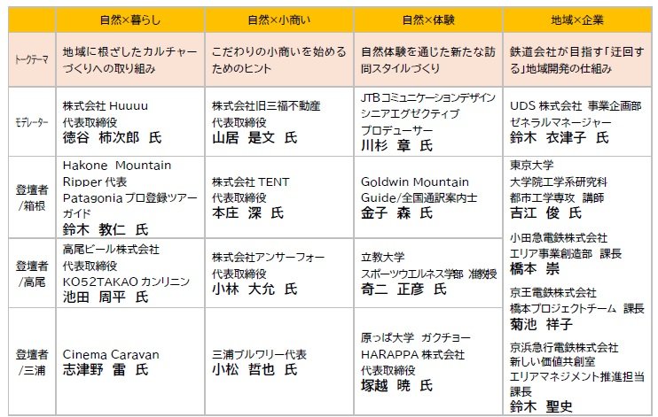 箱根・高尾・三浦エリアで活躍する地域プレーヤーやまちづくりに関する有識者などに登壇いただくほか、「〈迂回する経済〉の都市論: 都市の主役の逆転から生まれるパブリックライフ」の著者である吉江 俊氏と、鉄道3社のまちづくりセクションを担う担当者が、地域とともに企業成長してきた背景や、本プロジェクトを通じて成し遂げたいビジョンなどをお伝えします。