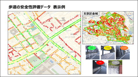 歩道の安全性については、歩道の独立性や万が一の場合の車両接触の危険性について判断しています。実際の「走行画像」を、解析し、歩道の安全性を5段階で評価した国内唯一*のデータです。この分析により、危険個所を特定することができるため、交通安全施策や都市計画などでの活用が期待されています。今回、文京区全域をオープンデータとして公開します。