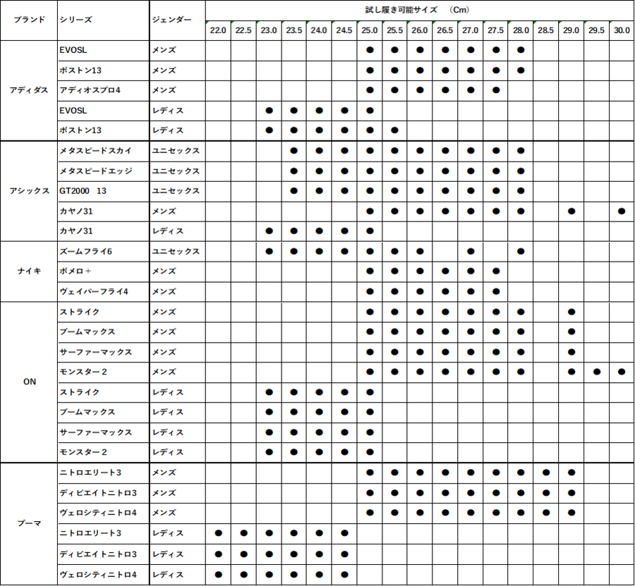 ※試履き可能シューズは記載の商品一覧よりご確認ください。