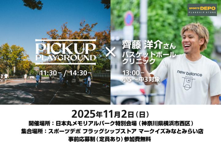 公園に集まった老若男女さまざまなプレイヤー達が即席のチームを組んで行うゲームのことをピックアップゲームと呼びますが、コートの周りのゴミ拾う行為も含めて「PICK UP PLAYGROUND」と名づけました。イベント当日は「齊藤 洋介」さんによるクリニックも同時開催。※2回目のみ実施。