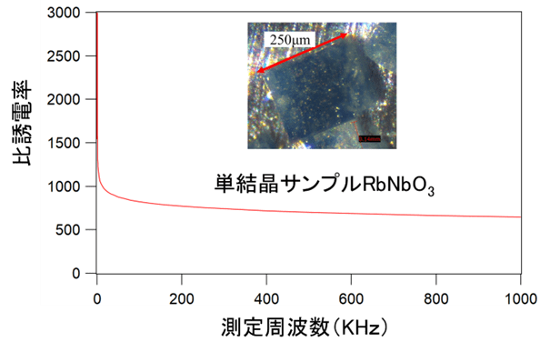 これらの候補材料について非平衡プロセスを用いた合成検討を行い、非平衡合成性プロセスの一種である高圧合成によりペロブスカイト型RbNbO3の合成に成功した。合成したペロブスカイト型RbNbO3の結晶構造を詳細に分析したところ第一原理計算から予想された強誘電体相転移が確認された。また、ペロブスカイト型RbNbO3の単結晶サンプルを合成し誘電率を測定したところ、図3に示すように、室温において1000~800程度の巨大な誘電率を確認した。これは第一原理計算から予測した巨大誘電率発現機構がペロブスカイト型RbNbO3に作りこむことに成功したことを明確に示している。この単結晶サンプルを高分解能透過型電子顕微鏡(TEM)にて微構造解析を実施したところ非常に高密度な積層欠陥等が確認された。これらの構造欠陥は材料の誘電特性を著しく低下させることが知られており、これら構造欠陥を低減することができれば、さらに高い誘電率を有している可能性が高く、BaTiO3を凌駕する巨大誘電率材料である可能性がある。現在、著者らはペロブスカイト型RbNbO3の真の誘電率を決定すべく、サンプルの高品質化に取り組んでいる。