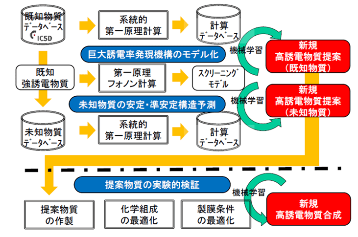 現在、スマートフォンやパソコンなど多くの電子機器に積層セラミックスコンデンサ(MLCC)*1が用いられている。このMLCCの誘電体材料にはペロブスカイト型結晶構造を有するチタン酸バリウム(BaTiO3)*2が用いられている。このBaTiO3は室温付近で4000程度の巨大な誘電率を有しており、この巨大な誘電率を活用しMLCCの小型大容量を実現している。BaTiO3は発見からすでに80年が経過しており、これまで多くの材料探索実験の努力にも関わらず、このBaTiO3を凌駕する巨大誘電率材料は見出されていなかった。著者らは、材料探索が通常の合成プロセスを用いた網羅的な材料合成実験によるものであったため、通常の合成プロセスでは合成できない、準安定な材料*3などは探索できなかったことも原因の一つであると考えていた。そこで本研究では、JFCC、芝浦工業大学との共同研究により、従来の実験主体の材料探索では合成できない準安定な材料を含めた広大な材料空間をくまなく探索するために、図1に示すような巨大誘電率材料探索スキームを考案した。第一原理計算*4に基づくフォノン計算を活用してマテリアルズインフォマティクス*5による巨大誘電率材料の探索を実施し、複数の候補を導出に成功した。これらの候補材料について非平衡合成プロセス*6を用いた合成検討を行い、非平衡合成プロセスの一種である高圧合成*7により準安定なペロブスカイト型RbNbO3の合成に成功した。合成した単結晶の品質はまだ充分ではないものの室温にて1000~800程度の巨大誘電率を確認した。この結果は第一原理計算に基づくフォノン計算を活用したマテリアルズインフォマティクスによる巨大誘電率材料の探索の有効性を示しており、BaTiO3を凌駕する巨大誘電率材料開発の可能性が示唆される結果である。