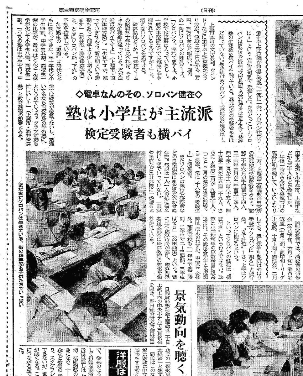 電子卓上計算機が急速に普及。「一家に一台、ソロバン代わりに…」という宣伝文句まで登場した。だがどっこい-ソロバンはまだまだ健在。文房具店での売れ行きはまずまず。珠算塾の生徒数も横バイを続けている。珠算検定の受験者もさほど減っていない。【昭和50(1975)年5月21日上越版】