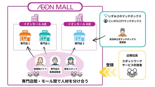 「マッチボックス」は、スキマバイトのプラットフォームです。特許取得済みの独自機能により複雑な税区分の切り替えや休業手当が自動計算されるほか、専門店の業務負担を大幅に軽減するため、採用、労務処理、給与振込までを一元的にサポート。イオンモールが施設全体で人材を確保し、専門店間・モール間で人材を分け合うことで、夫々が人手不足に伴う機会損失の減少を図ると同時に、イオンモール周辺地域の求職者に対しても柔軟に働ける環境を提供いたします。また、イオンモール新潟亀田インター・イオンモール日根野は、新潟市・泉佐野市公式の自治体マッチボックス(にいがたCITYマッチボックス・いずみさのマッチボックス)とも連携し、更なる地域雇用の創出をめざします。