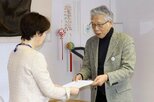「ちめいどうまつり」で展示する大関さんの写真を紹介する森川政嗣理事長兼病院長=上越市西城町3