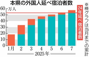 今年1〜7月の外国人延べ宿泊者数が、過去最高だった2024年の実績約53万人を上回り、約58万人に達したことが9日までに観光庁のまとめで分かった=グラフ参照=。県国際観光推進課は「スキー客などの冬季偏重の傾向はあるが、グリーンシーズンの誘客効果が一定程度出始めている」と説明する。