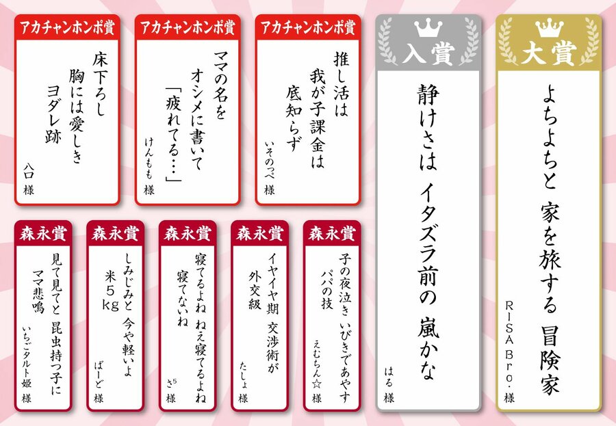 以下、赤ちゃん本舗)と、森永乳業株式会社(本社:東京都港区 以下、森永乳業)は、共同企画として3回目となる「子育てあるある川柳」を実施し、入賞作品10句が決定しましたのでお知らせいたします。