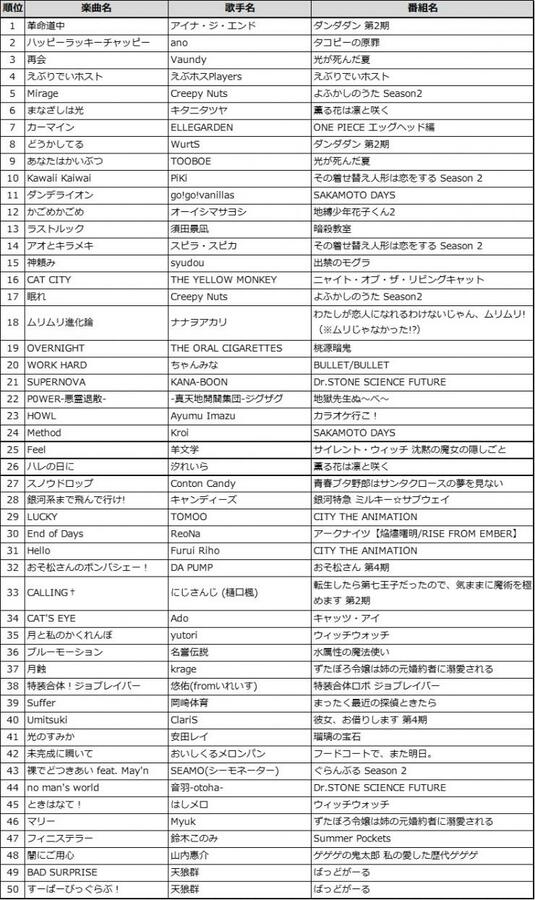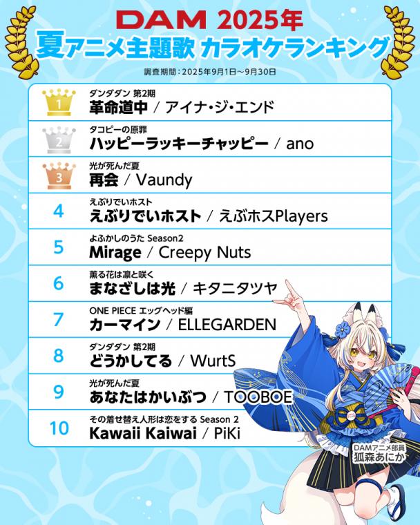 ■DAM 2025年夏アニメ主題歌 カラオケランキング TOP50