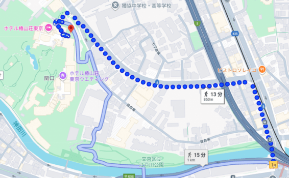 ・1a出口から地上へ出て神田川の橋(江戸川橋)を渡る