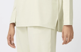 裾に前後差をつけることで、見た目のアクセントとして親しみ感を演出。ヒップや腰回りを自然にカバーし、スリットとの組み合わせで縦ラインを強調することで脚長効果も期待できます。
