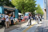 大手ハンバーガーショップ「バーガーキング」のフードトラック販売に並ぶ人々=10日、新潟市中央区東大通1のJR新潟駅前