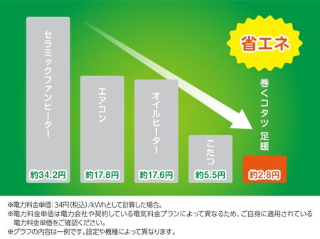エアコンやセラミックファンヒーターで部屋全体を暖めると電気代が気になる方でも、室温を下げて『巻くコタツ』を使用すれば、必要な場所だけを効率的に温められます。