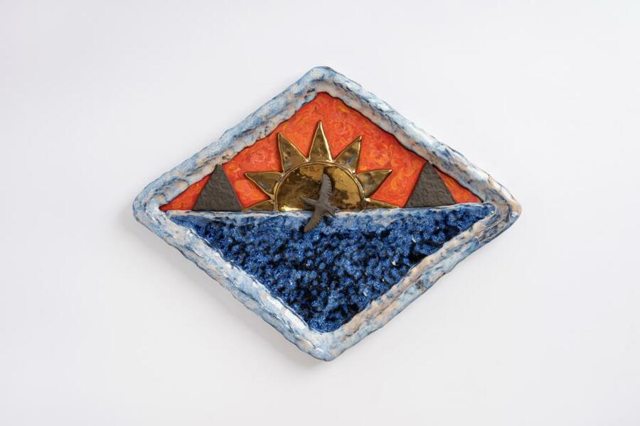 《二つの島を行き来するカモメ 2》H305×W395×D30mm 粘土、釉薬、金、油絵具、酸化焼成2025年