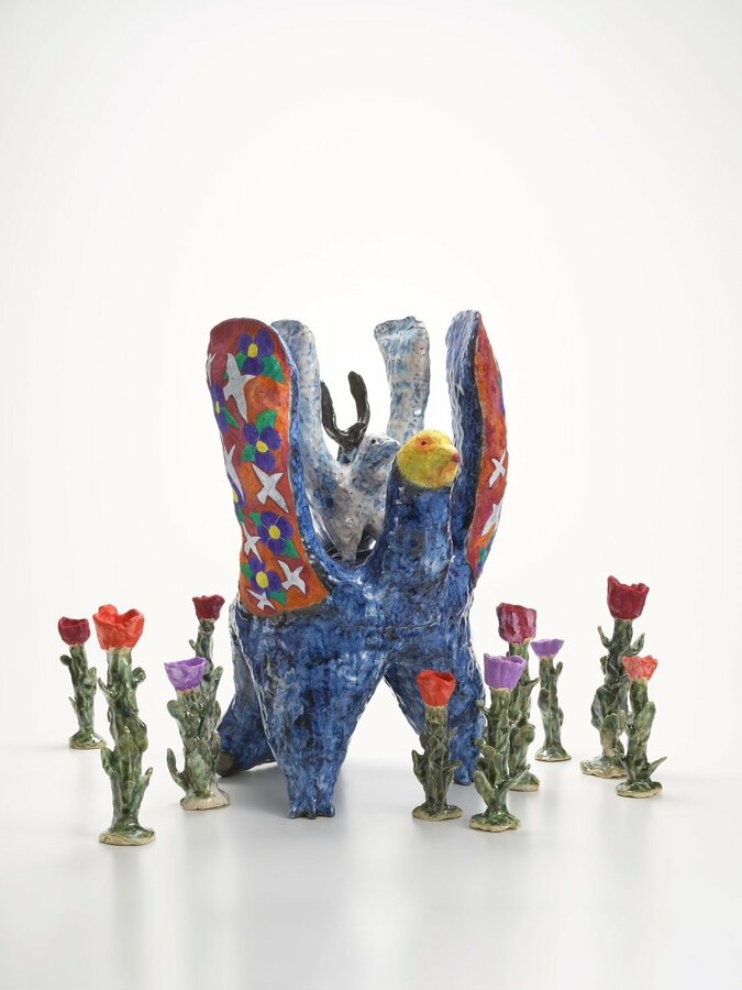 《夕べ生まれ羽ばたく》H400×W450×D600mm(可変設置) 粘土、釉薬、ガラス、油絵具、酸化焼成 2025年