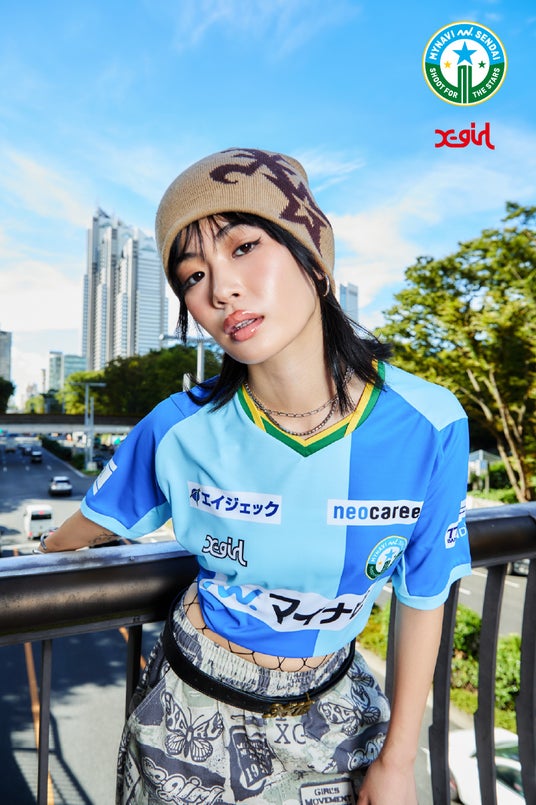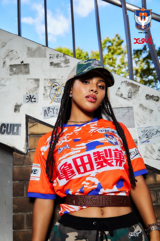 7クラブそれぞれの個性を表現したデザインやアイコニックなカラーリングと、X-girlの個性が融合したコーディネートを提案。コーディネートの特徴は、ユニフォームをメインとし、デザイン性のあるスカートやパンツを使用したX-girlらしいスタイリングに仕上げました。ピッチ上の選手とともに、ストリートを彩るファッション性の高いスタイリングとなっています。