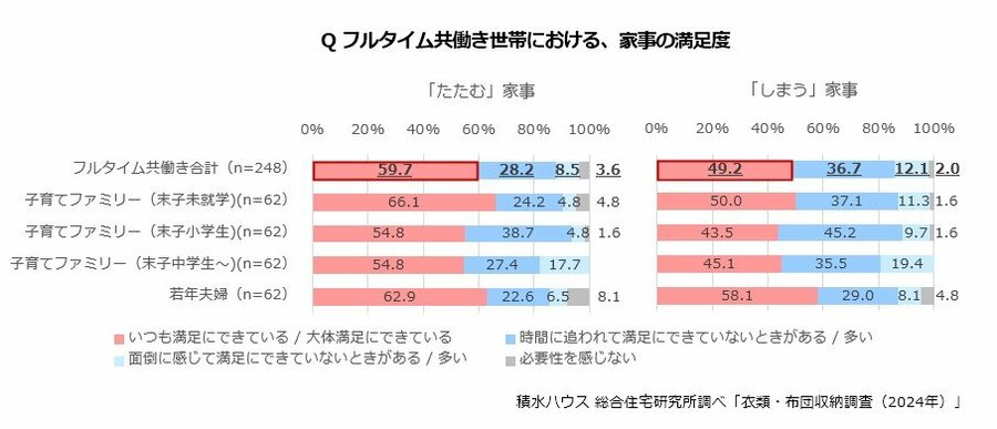 一息つけないだけでなく、忙しい日々の中で時間に追われたり面倒に感じたりして、家事が満足にできていないと感じる人も少なくないようです。衣家事のうち「たたむ」「しまう」家事の満足度を聞いたところ、フルタイム共働き世帯のうち「いつも満足にできている」または「大体満足にできている」と回答した人は、「たたむ」は6割以下、「しまう」は半数以下にとどまりました。