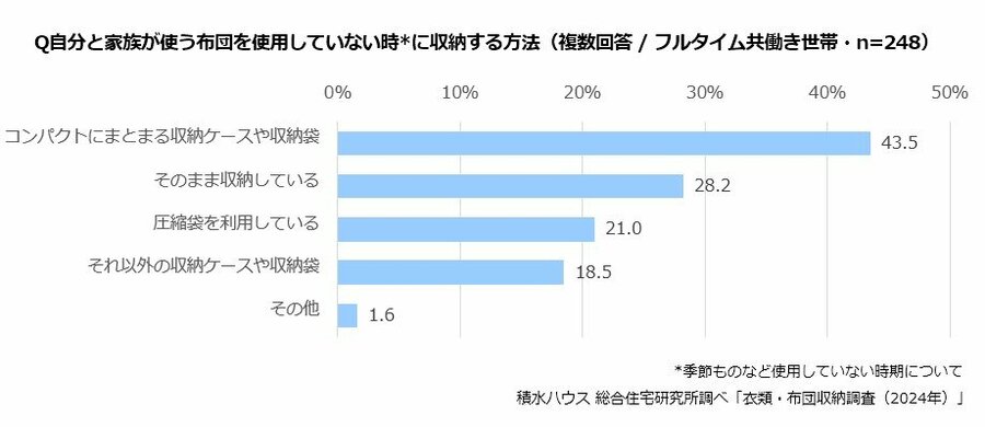 かさばる布団はクローゼット収納が最多、4割以上がコンパクトにまとまるケースや袋、2割以上が圧縮袋を使用