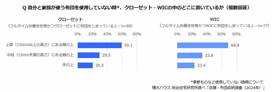 続いて、衣類とともに収納の大きなスペースを占める布団についても、収納場所や収納方法を聞きました。収納場所について、自分と家族が使う布団のうち、季節ものなど使用していない時期の布団は「クローゼット」35.5%、「WIC(ウォークインクローゼット)」31.0%と、クローゼットにしまっている人が多いことがわかりました。