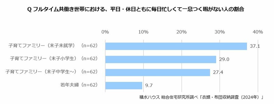 フルタイム共働き子育てファミリーの3~4割は、平日も休日も一息つく暇がない