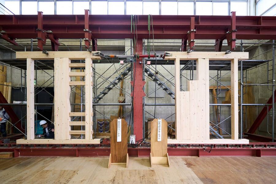 耐力壁とは、建物において地震や台風などの水平荷重に抵抗する壁のことです。カベワンGPは年に1度、木造耐力壁の強さ日本一を決める大会で、全国の大学や専門学校、企業などが出場。2体の木造耐力壁の土台を固定した状態で引き合い、どちらか一方が破壊される、または所定の変形値を超えることで勝敗が決まるトーナメント大会です。同じ耐力壁で初戦から決勝まで戦うため、剛性だけでなく持続的な耐久性も不可欠です。また、建築を志す学生や企業の技術者らが競い合い、ナレッジを共有することで木造建築の発展に貢献しています。