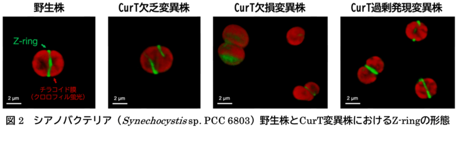 遺伝子操作によってCurTタンパク質を作れなくしたシアノバクテリアを観察したところ、細胞が正常な球形ではなく、いびつな形になったり、大小不均一な大きさで分裂したりする異常を発見した(図1)。これは、細胞分裂が正常に行われていないことを示している。さらに詳細に解析を進めた結果、CurTタンパク質が、バクテリアの細胞分裂で中心的な役割を果たすFtsZタンパク質と直接的に相互作用することを突き止めた。FtsZは細胞の中央にリング状の構造(FtsZリング)を作り、そこがくびれて細胞が二つに分かれる(図2)。CurTタンパク質は、このFtsZリングの正しい配置や機能に関わることで、細胞分裂の精度を保つ役割を担っている可能性が強く示唆された。