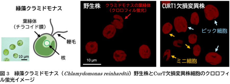 この機能が真核生物である緑藻の葉緑体にも保存されているかを調べるため、クラミドモナスでCURT1タンパク質を欠損させた。その結果、細胞分裂は正常である一方、内部の葉緑体が非対称(ミニ細胞とビック細胞)に分裂し、大きさの異なる娘葉緑体が作られることを見出した(図3)。この結果は、CurT/CURT1タンパク質が、シアノバクテリアでは細胞全体の分裂、緑藻では葉緑体の分裂という、それぞれの生物における分裂現象の「質」を保証する共通の役割を担っていることを示している。