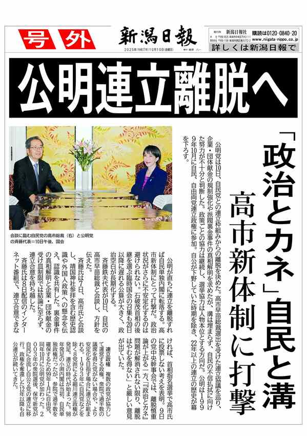 【号外】公明党が連立政権離脱へ 2025/10/10 16:20 (最終更新: 2025/10/10 16:22) PDFで号外を見る トップページで最新情報を見る 関連ニュース 【号外】新潟県知事が柏崎刈羽原発再稼働を容認 11/21 【号外】日経平均初の5万円台 10/27 【号外】新首相に高市早苗氏、女性で初めて選出 10/21 【号外】燕市の新市長に前市議の佐野大輔氏 10/20 【号外】北信越高校野球・帝京長岡が優勝 10/19 【号外】ガザ全人質解放へ 10/9 【号外】ノーベル化学賞に北川進京都大特別教授 10/8 ノーベル化学賞に京都大特別教授の北川進氏ら 10/8 【号外】ノーベル生理学・医学賞に大阪大栄誉教授の坂口志文氏ら3氏 10/6 【号外】自民党新総裁に高市早苗氏 10/4 【号外】石破茂首相が辞任の意向 9/7 【熱中症に注意】新潟県内に熱中症警戒アラート発表中(8月26日) 8/26