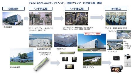 東北圏2拠点において、安定生産を実現するため機種別生産割り付けを行い、BCP対応として主流機種の両拠点での生産やライン共用による生産変動に柔軟に対応することで、生産性向上を図ります。これにより、今後のPrecisionCoreプリントヘッド搭載インクジェットプリンターの需要増加による製品ラインアップ強化などを可能にしていきます。
