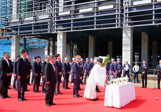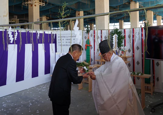 上棟式には、設計をご担当いただく、株式会社日建設計の常務執行役員 クライアントリレーション部門統括 佐藤 健様、施工をご担当いただく鹿島建設株式会社の執行役員 北陸支店長 木村 淳二様らとともに、トラスコ中山株式会社の代表取締役社長 中山 哲也が参加し、上棟の儀や玉串奉奠(ほうてん)などの儀式を滞りなく執り行いました。