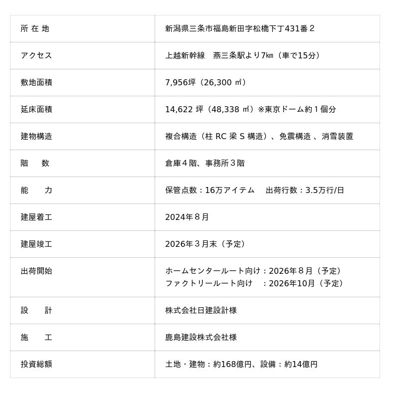新潟県三条市にある、既存の当社ホームセンタールート向け物流センター「HC東日本物流センター」は、建設から約30年が経過し、建物や設備の老朽化が進んでいます。また、ホームセンター様への売上拡大に伴い、在庫保管能力や出荷能力が限界に達しつつあることから、より効率的な作業環境を構築するとともに、ホームセンター様をはじめ、より多くのお客様のニーズにお応えするため、物流センター「プラネット新潟」の建設を決定いたしました。