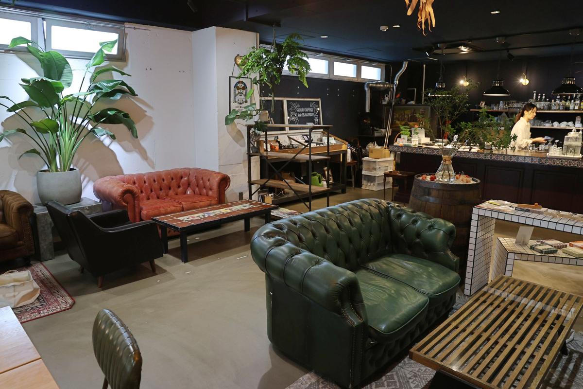 阪急神戸線の御影駅から徒歩で約10分。白と黒を基調に落ち着いた色合いの「アルスター&ガーテン」の店内は、アンティークの家具や多くの観葉植物が置かれている。ゆったりとした造りで、くつろげる空間を演出している。