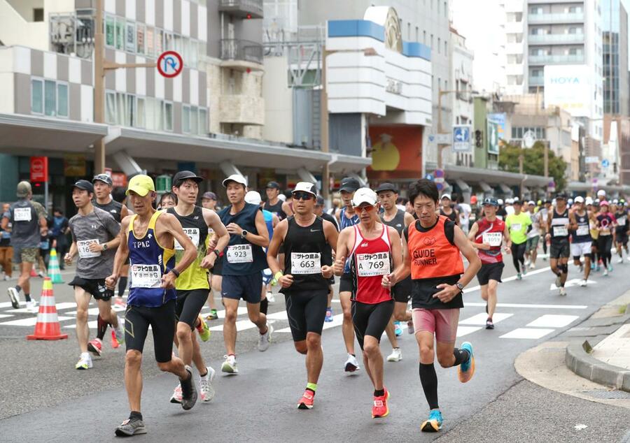 新潟市の中心市街地や海岸線を走る「第41回新潟シティマラソン」が12日、開かれた。県内外から参加した約1万3千人のランナーが、秋雨の県都を駆け抜けた。フルマラソンは東京都小平市の公務員大橋秀星さん(35)が大会新記録の2時間17分29秒で4連覇を果たした。