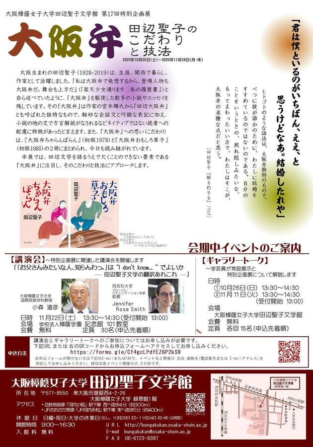 大阪樟蔭女子大学(大阪府東大阪市菱屋西)は、10月25日(土)~11月24日(月・休)に大阪樟蔭女子大学田辺聖子文学館にて、第17回特別企画展「大阪弁 ―田辺聖子のこだわりと技法―」を開催します。