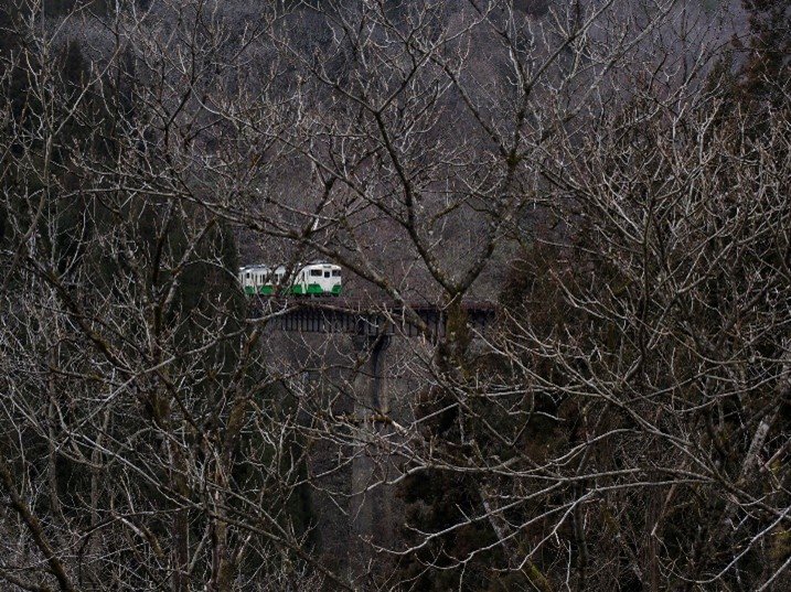只見線の滝谷駅(福島県柳津町)近くでは、雑木林の先に鉄橋が見えました。曇天でしたが、冬枯れの木々にわずかに光を与えていました。その光をより強調するために露出補正をして画面全体を少し暗くしました。仮に車両の色が緑や赤など濃い色なら...