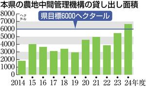 農地集約の仲介役として設置されている農地中間管理機構(農地バンク)が2024年度に県内で貸し出した農地の面積は、前年度比22%増の6664ヘクタールと過去最大だったことが、12日までに分かった。制度が始まった14年度以来、県が掲げる6千ヘクタールの目標を初めて達成した=グラフ参照=。増加は2年連続で、都道府県別では9年連続で1位だった。